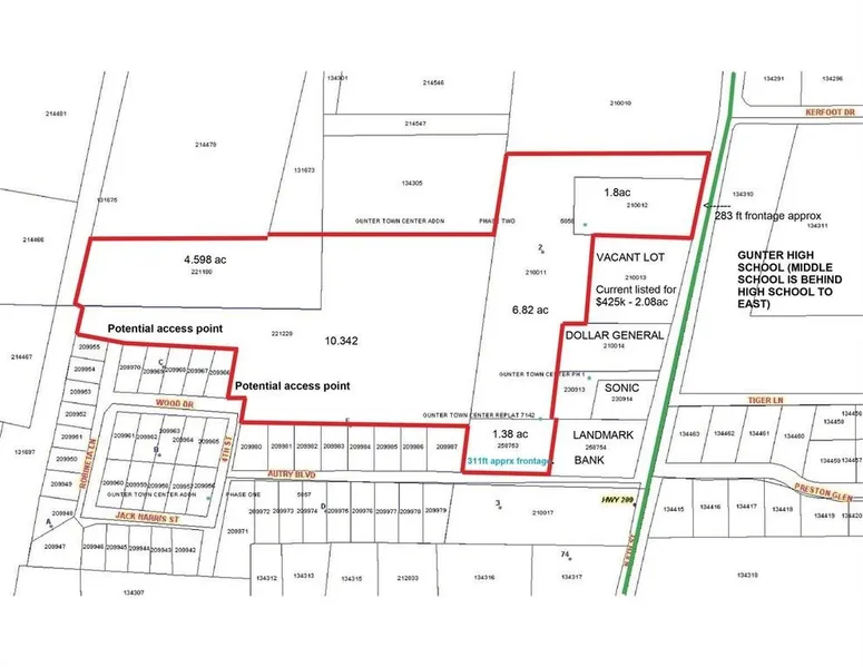 You cannot find better located land in Gunter, a city on the growth path. Very reasonably priced considering location, and size. Frontage on Preston Rd and Autry Blvd. Entry point may be made from 4th St and Robineta Ln also. Multiple plats - develop one at a time or or all together. Residential and commercial possibilities.... You won't find a better land in Gunter once this is gone. NOTE: BUYER IS RESPONSIBLE FOR CONFIRMING ALL DETAILS RELATED TO ZONING, ROAD EXTENSIONS, USAGE, UTILITIES, EASEMENTS, ETC. The seller has a survey that will be provided to the buyer. If the lender or title company requires a new survey, the buyer pays for new survey. See attachment for plat details, parcel ids, etc.