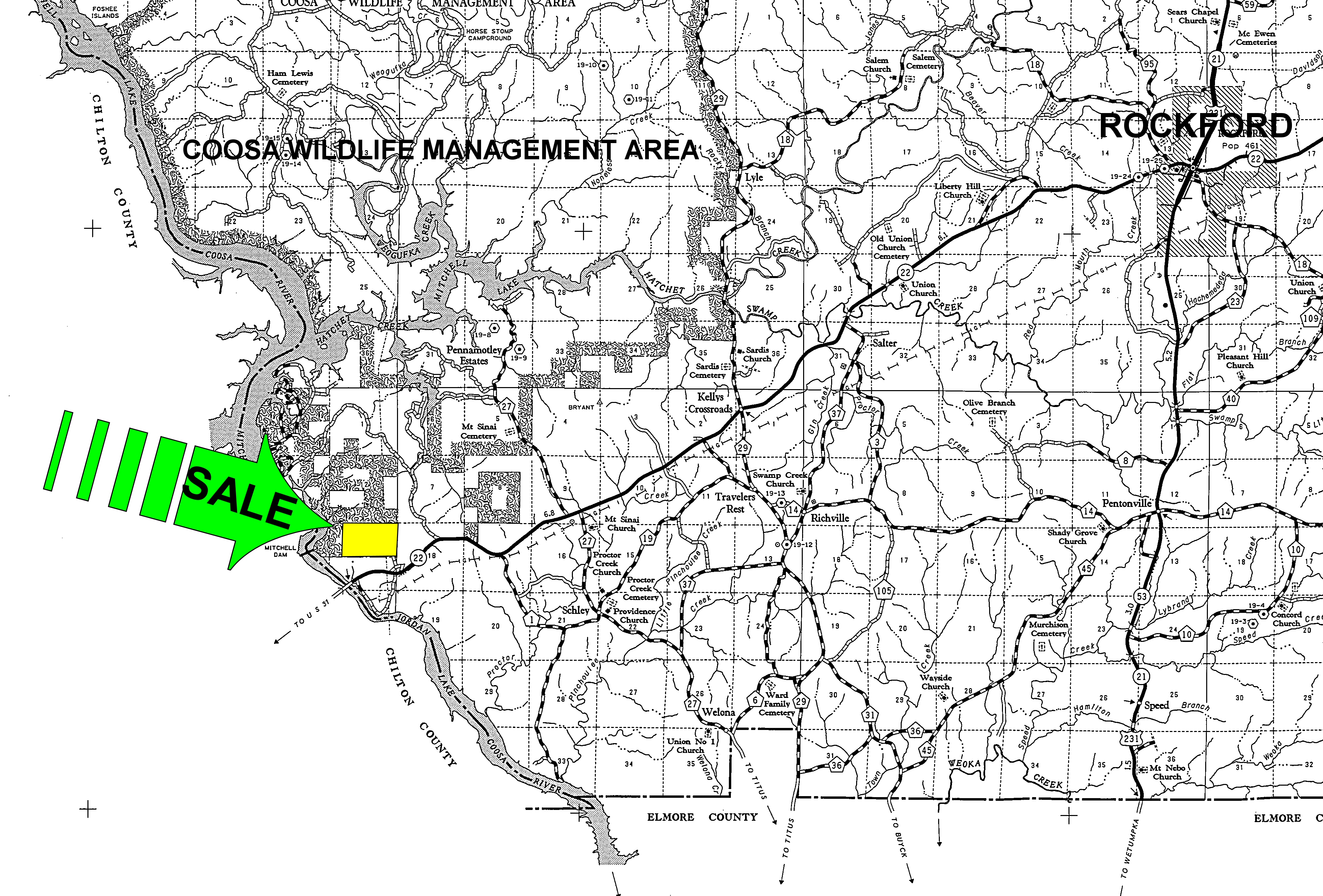 From I-65 Exit 205 at Clanton (U. S Hwy 31 exit) go 4.0 miles south on U. S. Hwy 31 (away from Clanton) and take a left onto AL Hwy 22. Go 6.7 miles (crossing over the Coosa River) and take a left on Coosa County Road 308. Go 0.3 miles (bearing left at the fork) to the south line of the property. Look for the Cyprus Partners sign and pink flagging. You are welcome to look on your own or you can set up an appointment. Use the topo map as a guide from this point. The south line crosses County Road 308 at Lat: 324817.80 N. Lon: 862522.63 W.