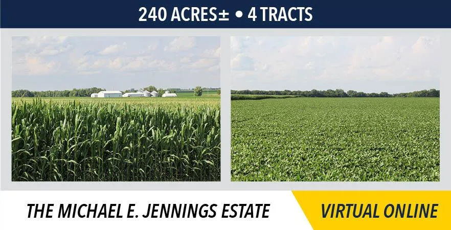 The Jennings Farms will be sold in (4) four individual tracts. Tract 1, 2 & 3 will sell on a price per acre basis, based upon a survey that is currently in progress. Surveyed acres will be used to constitute the final settlement price. Tracts 1, 2 & 3 will be sold through the marketing method of Buyers Choice whereas the high bidder can elect any or all tracts, in any combination for their high bid. Buyers Choice auctioning will continue until all three tracts have sold. We will then sell Tract 4 for a Lump Sum total dollar amount. Immediately following the auction, the successful bidder(s) shall enter into a written agreement with the sellers. Taxes will be prorated to the date of possession. Possession will be given on all tracts at the time of closing, subject to the current lease with the tenants running through February 2024. All tracts sell free and clear for the 2024 farming season. Immediately following the auction, the successful buyer(s) will be required to sign a real estate sales contract and pay ten percent (10%) of the purchase price as a non-refundable down payment which will be held in escrow until closing. The balance of the purchase price will be due at closing which will take place on or before October 2, 2023 upon delivery of a merchantable abstract and deed. Possession will be given at the time of closing, subject to the current lease. Contact the auction manager for lease details. Bidding is NOT subject to any contingencies, including but not limited to financing, an appraisal or inspection of the property. All announcements made sale day take precedence over prior advertising either written or oral. The information in our brochure, in our advertisements and on our website is believed to be accurate; however, no liability for its accuracy, errors or omissions is assumed. All lines drawn on maps, photographs, drone video, etc. are approximate. Buyers should verify the information to their satisfaction. There are no expressed or implied warranties made by the seller or Sullivan Auctioneers, LLC pertaining to this property. Real estate is being sold AS IS.