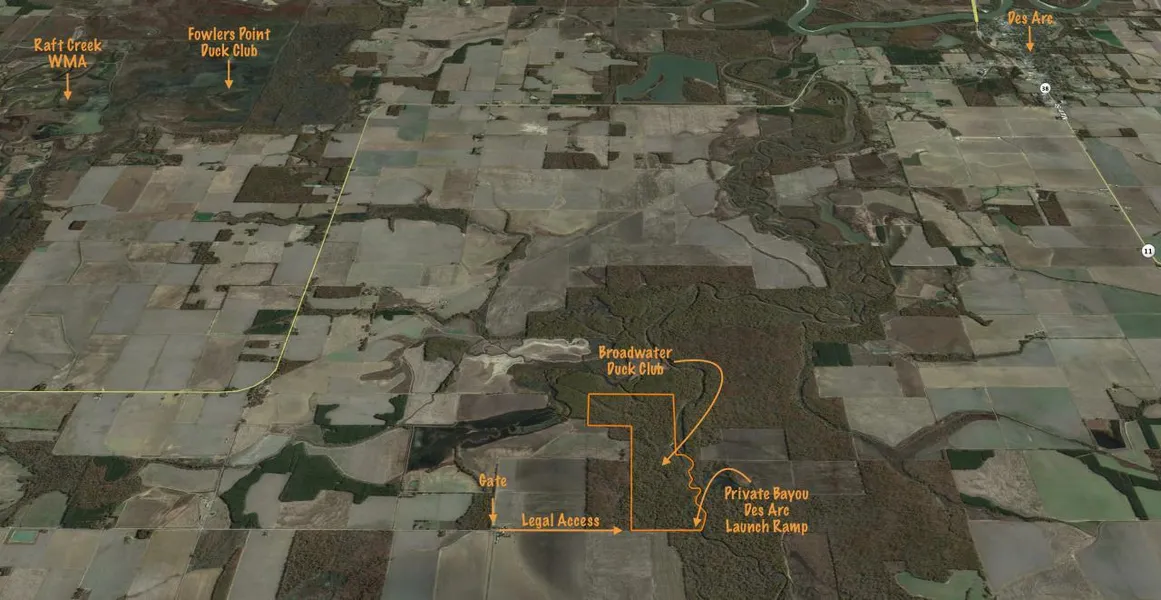 Big hardwood timber, private launch ramp on Bayou Des Arc, gated access, end of the road, whitetail travel corridor, flooded oaks, fishing....