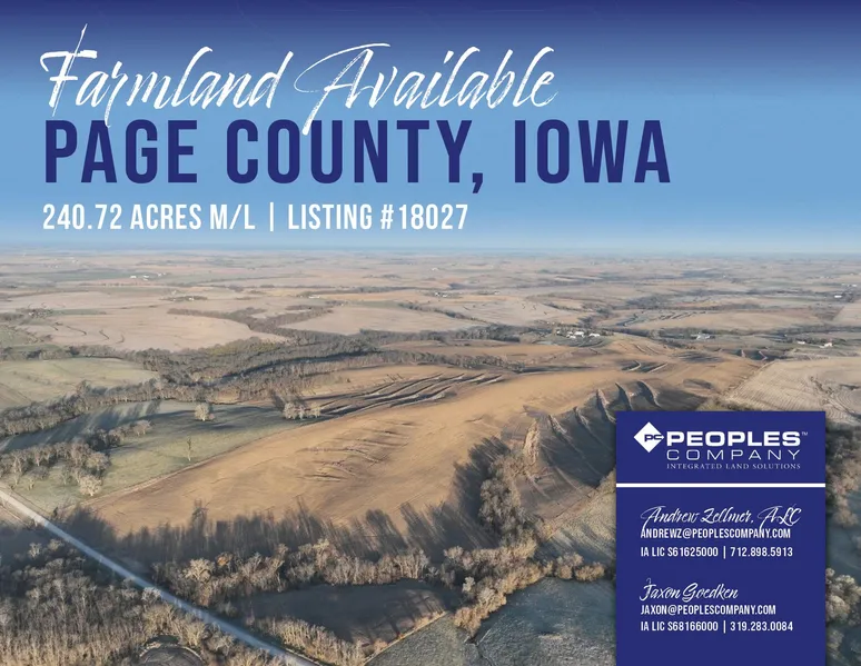 Peoples Company is pleased to present 240.72 m/l acres of high-quality Page County farmland located just east of College Springs, Iowa. This property offers a prime mix of productive farmland and exceptional recreational potential. With 211.96 FSA cropland acres and a CSR2 rating of 59.6, this farm would make an excellent addition to any farming operation or investment portfolio. Primary soil types include Colo-Judson Silty Clay Loam, Sharpsburg Silty Clay Loam, and Adair Clay Loam.
