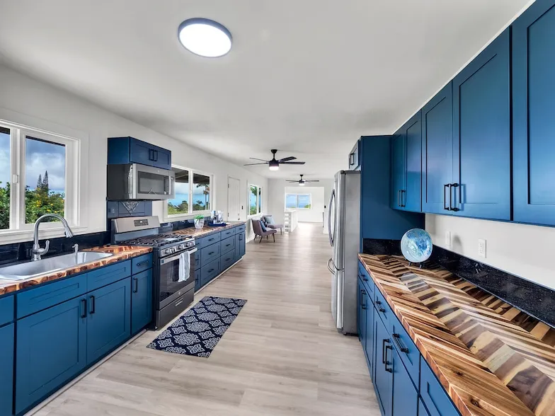Spacious, Stylish, and Move-In Ready! This beautifully updated home offers the perfect blend of modern comfort and generous space ideal for large families, remote workers, or hobbyists who need room to spread out. Upstairs, you ll fall in love with the stunning new kitchen, featuring bold cobalt blue cabinets, butcher block countertops, and sleek black accents. Outfitted with all-new appliances including a French door refrigerator and a chef s stove plus deep pot drawers and abundant storage, this kitchen is a dream for home cooks and entertainers alike. The expansive great room is flooded with natural light thanks to walls of windows overlooking Hilo, creating a bright, cheerful living space. Just off the kitchen, a newly renovated bedroom and full bath offer privacy and flexibility, with an adjacent bonus room that can be used as a formal dining area or easily converted into an extra bedroom. Downstairs, you ll find a wide hallway with a dedicated laundry area and three oversized bedrooms, served by two fully renovated bathrooms. One bedroom features its own exterior entrance, making it an ideal space for a home office or guest suite. Thoughtfully upgraded throughout, the home boasts a brand-new roof, new windows, fresh interior and exterior paint, modern ceiling fans, new Beechwood flooring, and stylish fixtures. Set on over 9 acres of fertile soil, this property is a paradise for anyone with a green thumb. Enjoy breathtaking, ever-changing views of Mauna Kea, Mauna Loa, and Hilo all just minutes from downtown, at a cool and comfortable elevation. Don t miss the opportunity to own this large and lovely slice of Hawaii!