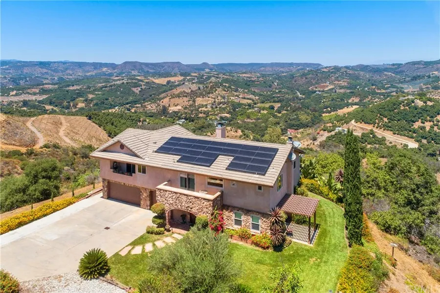 Welcome to this stunning 10 acre estate in the beautiful community of DeLuz. As you enter the private driveway you are greeted with beautiful stonework and a magnificent grand views of the Santa Rosa Plateau. This custom designed home was remodeled in 2012 and features an inviting foyer with a beautiful grand staircase that leads to the main floor of this exceptional home that offers panoramic views, patio and decks from every room. The upper level of the home includes a designer/chef's kitchen with custom cabinets, 1" high end granite counter tops and Thermador stainless steel appliances. The magnificent formal dining and living rooms offer breathtaking panoramic views with an ocean breeze from every room. Also, on the upper level is an extraordinary master suite and master bath with a spa tub surrounded marble tile and a large frameless shower and custom walk-in closet system. The secondary bedroom includes a balcony with forever views and updated bath. The lower level offers a living room and two large bedrooms with private patios, a bathroom with wheelchair access and large laundry room. This home also features beautiful wood and travertine floors, three fireplaces, an oversized 3 car garage large enough to add a room or gym, a solar system and a separate 2 inch water meter supporting numerous fruit trees. The owners have enjoyed the stunning panoramic views, peaceful serene environment, direct access to deck and patios from all rooms, ocean breeze's, big beautiful sky.