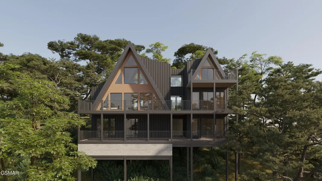 Discover your future mountain retreat in this stunning modern A-frame pool chalet, a perfect blend of sleek modern design and Smoky Mountain charm. This pre-construction gem boasts 4 spacious bedrooms and 6 luxurious full baths, offering ample space for families and guests alike (will sleep 12 comfortably). The open-concept layout features soaring ceilings, expansive windows, and high-end finishes that flood the home with natural light and breathtaking views of the surrounding nature. On the main level you'll be greeted by a state-of-the-art kitchen and inviting living room with soaring 16ft tall ceilings, a dedicated dining room, a massive deck space for outdoor dining (32x12), and a main level full bedroom with it's own walk out doors to the expansive deck. On the top level, you have a game room with ample space for a pool table and arcade games, as well as a queen over queen built in bunk bed for the kiddos! This level also features a dedicated bedroom + full bathroom, with it's own private walk out deck. On the lower level you walk into the dedicated theatre seats, with enough space for 12 seats and a build in riser for the back row. This level also features a common area full bath, along with the final 2 bedrooms each with their own private en-suite baths, and sliding doors out the pool deck. The pool deck incorporates an outdoor/covered gunnite 30'x8' salt water pool, and a dedicated nook just for the hot tub. This property checks all the boxes for the highest performing properties in the Smokies with the amenities, sleeping capacity, and sheer modern mountain style and design (and obviously, the pool!). Rental projections ranging between $145k-$170k! Please note: As a pre-construction project, buyers will need to secure their own financing to initiate the build, with an anticipated completion timeline of 10-12 months after financing closes.