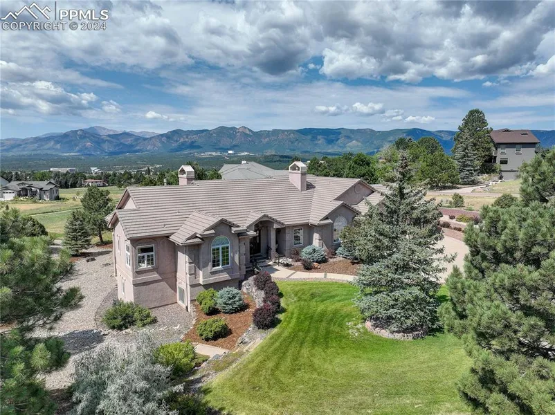 This carefully crafted ranch estate, thoughtfully designed by Architectural Designer, Larry Gilland defines luxury living in Gleneagle. The home boasts breathtaking 360-degree vistas of Pikes Peak, the Air Force Academy, and the Front Range - perched on a perfect 0.73-acre property. Step inside and experience nearly 5,000 square feet of living area featuring wood windows framing captivating views, handcrafted white trim accents with six-panel wood doors and baseboards, as well as designer blinds or Levolor shades that add a touch of elegance to every room. Upgraded flooring throughout complements the home's neutral paint scheme, with extensive use of alder wood built-ins and marble and stone accents. Take in the scenery on any of three outdoor living areas: spacious Timber Tech deck, a covered concrete patio on the lower level with walk-out basement, and a charming covered front porch with custom ironwork by Bliss Studio. Plus enjoy the peace of mind that comes with a durable stucco exterior and tile roof. One of the most significant benefits of this home is that it is exempted from the HOA. This would allow the owner to build an additional structure or expand the footprint of the home.