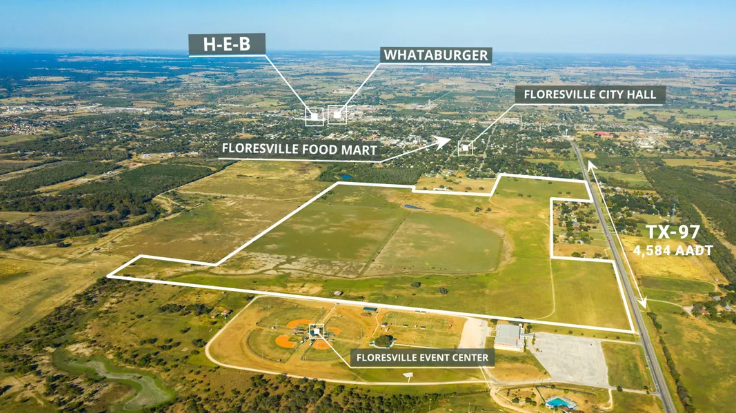 The Highway 97 Ranch is located within the growth corridor of San Antonio, Texas, on the corner of HWY 97 and Maple Street Rd, within the Floresville, Texas city limits. This property has 2,825 ft of HWY 97 frontage and 1,029+/ ft of frontage on Maple Street, with existing large water lines along the frontage and along the south fence line. These attributes make this well-located property a candidate for commercial or residential development. The ranch is currently being operated for agricultural use and is ag exempt from a tax perspective with an Annexation Agreement in place. Another unique feature of the HWY 97 Ranch is the groundwater, with multiple wells having the capability of producing around 3,200 GPM. The significance of this underground water is growing as water is becoming a more valuable commodity in Texas. All these mentioned features make the HWY 97 Ranch an excellent property for land investors and developers alike. ( A portion of the ranch lies within the FEMA Flood plain.)