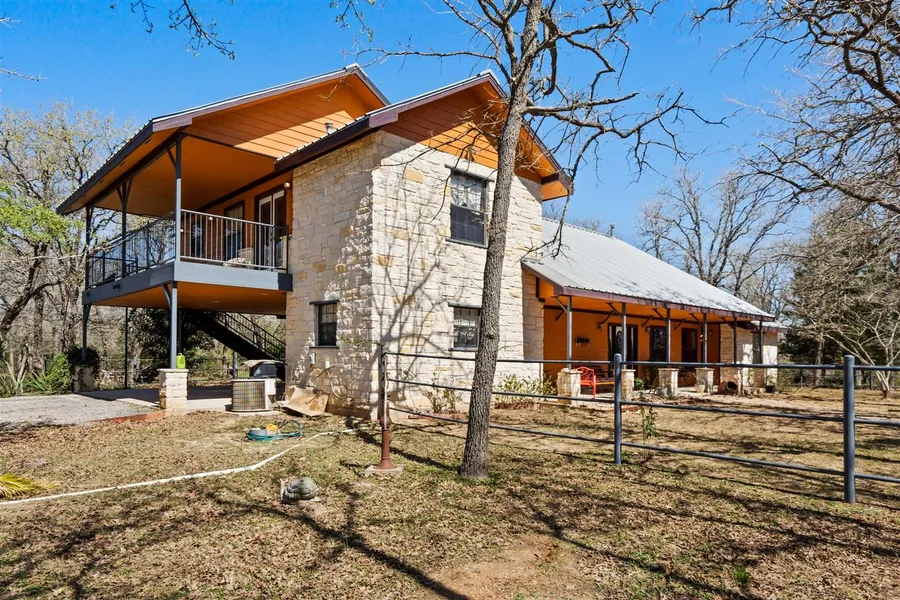 7.557 wooded acres with a nice custom home. 3 bedrooms, 2 full baths. Metal roof, covered porches front and back and a large balcony off the master suite. Rock and hardi-type exterior. Open kitchen / living / dining area with high ceilings. Breakfast area and bar in the kitchen. Concrete and tile floors through main areas and carpet in the bedrooms. Detached workshop with electric. 2 car carport. Convenient location just north of Lockhart with easy access to the toll road or Hwy 183.