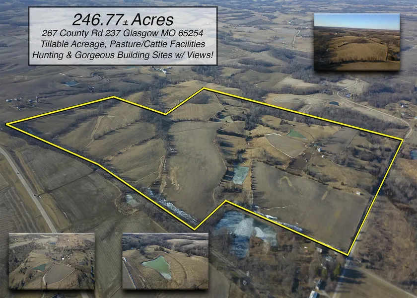 The Farm consist of 247 m/l acres with 136.33 currently in row crop production with remainder in pasture and woods. There is an older home on the property with barns, garage, fenced lots, nice sized ponds and good hunting potential.
