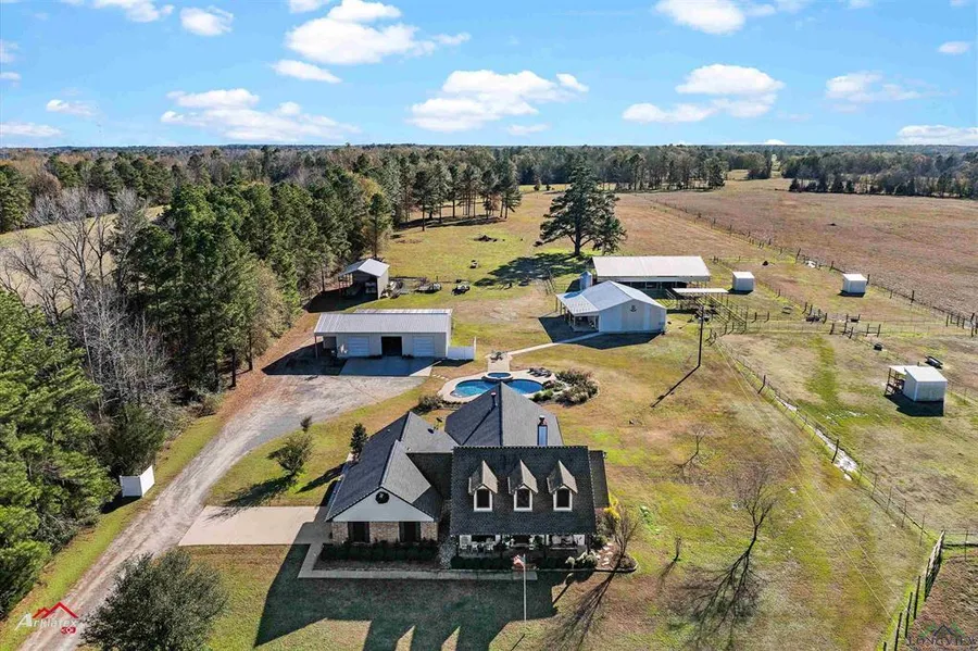 Home Sweet Home on Candyman Road! Sitting on a sprawling 23 acres of East Texas land, you will find your dream home with all the bells and whistles including a generator and underground tornado shelter where you will always feel safe. Completely fenced and cross fenced with 50x75 covered working pen/arena - this property is ready for your all your farming needs. Relax on your front porch that overlooks the beautiful pond or take a rest on your back porch that overlooks your relaxing pool with waterfall and hot tub, 30x60x20 shop with lean-to on the back as well as barn apartment (mother in law suit or man cave) that is completely heated and cooled with full kitchen, full bathroom and separate bedroom! Don't forget the 24x40 trailer barn with more pasture behind that with room to roam. Inside you will find an open concept living and dining room with TWO wood burning fireplaces with beautiful stone work and wood look tones throughout. Remodeled master bedroom and bathroom along with remodeled guest bedrooms and bathroom! An office space at the front of the home with dining room to entertain guests. Your dream property awaits!