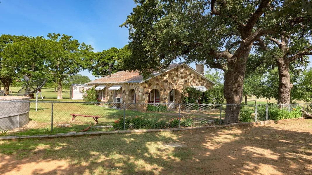 Rolling pastures with two watersheds; Five Mile Creek and Holland Draw converge on the ranch. Along these two draws are eight small spreader dams and three large tanks. Most of the pastures have been cleared of brush and you will be hard pressed to find a prickly pear, the owners hand cleared it. The seller's pride of ownership and love for this ranch really shows. The front pasture, approx. 95 acres has native grasses, improved grass; Wilman Love and Kline . The middle pasture has approx. 72 acres with native grasses. A third south pasture has 80.145 acres, of which 42 acres has recently been planted in W B Dahl, an Old World Bluestem. The middle and south pastures have small area of mesquite plots, good hiding places for the whitetail deer. There are many very matured, large post oak and live oak scattered over the ranch. The front pasture produced over a 1,000 bales of wheat one year, (not planted now.) The ranch is a nicely shaped rectangle. The north, east and west perimeter lines are fenced with 8' high game fencing. The south line is not fenced, but owner will complete with 8' high game fencing soon. The ranch is cross-fenced with net and or barbwire. A well with electric pump and well house are near the home. Another well is near the center of the ranch and an approx. 1,050' irrigation well was drilled in 1970 and seller has been told by area neighbors it is a high producing well. It is not equipped and hasn't been used by the owner. A charming all stone home was built in 1924 and has two bedrooms and one bath. The home has a living room with fireplace, dining room, bonus room with wood stove, covered front porch and open back porch. Surrounding the home is a large fenced yard with lush landscaping and beautiful huge shade trees; live oak, post oak and pecan. Also, there are mature flowers and shrubs and a storage building with washer and dryer hook-ups. Adjoining the yard is a fenced pecan orchard.