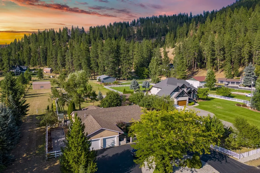 Rare Dalton Garden Custom Rancher on 2.64 acre property. 6 bdrms (1 non-conforming) 3.5 bths with 4,400 sq ft. Main floor Master. Beautifully finished basement. Updated kitchen, and new fridge. Enjoy your expansive covered back deck with the natural gas grill and the panoramic view being located at the base of Canfield Mountain. Second driveway to access back of property acreage to barn with oversized door that can accommodate all of your storage needs. Property crossed fenced for variety of animals. Fully finished outbuilding can be used as a satellite office space, or hobby shop. Orchard filled with variety of fruit trees. This home hosts plenty of storage and space yet very private as it is tucked away among all the Arborvitaes and surrounding trees.