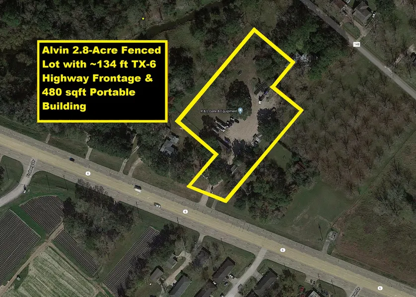Alvin 2.808-Acre Fully Fenced Lot with 480 sqft Portable Building Near TX-35 & Proposed TX-99. Property has ~134 ft TX-6 State Highway Frontage & half the lot stabilized with gravel. 480 sqft Portable Building has Half Bath. Property is on north side of the 7-lane State Highway that runs from Galveston to the east all the way west through Sugar Land and into Hwy 290 in Cypress before continuing on to Bryan/College Station). Located within Alvin city limits, which has no zoning. Currently, water & wastewater are provided by well & septic system, however the City has water & sewer lines along TX-6 that will allow for further development of the site. Located on the far west side of the City of Alvin 3.4 miles west of TX-35. 12 Miles to Pearland. 7.8 miles to TX-288 in Manvel. 30-Minutes to Downtown Houston. TX-99/Grand Parkway will connect TX-288 to I-45 via TX-35 & FM 517 to provide more access routes to Houston. Per the Texas Railroad Commission GIS Maps, there are no pipeline easements or drill sites on the property. A review of the Deed shows no restrictions. The current FEMA Maps show the land to be in a mix of Shaded Zone X (500-year flood plain) and AE (100-year flood plain). 2018 TxDot traffic counts for TX-6 averaged 28,283 cars/day passing property. Perfect for an equipment/truck yard, outdoor sales lot, garden/landscape center, boat/RV storage lot or warehouse space.
