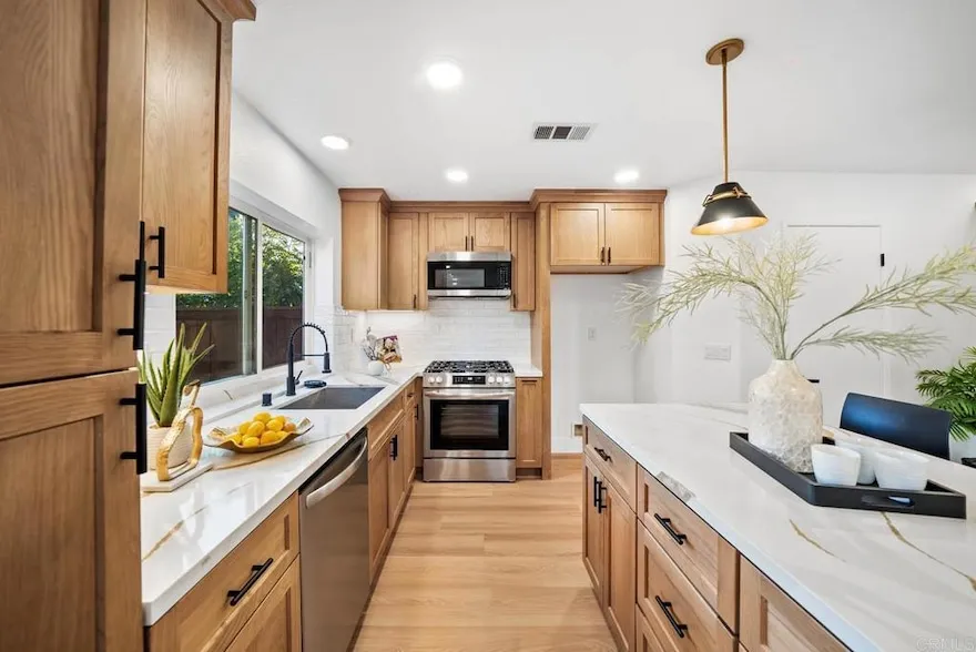 This beautiful 3-bed, 2.5-bath home spans 1,460 sqft and features a sleek, modern design with an open-concept layout. The living area boasts beautiful wood flooring, a sleek fireplace with a dark tile accent, and large windows that flood the space with natural light. The kitchen includes light wood cabinetry, a large island with striking marble countertops, and contemporary lighting. The master bathroom is luxurious, with dual vanities, a large walk-in shower, and modern fixtures. The home offers bright and spacious living spaces with high-end finishes throughout.