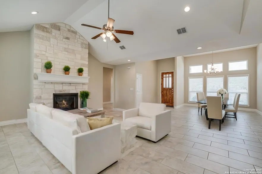 Discover this stunning hill country home featuring 3 bedrooms and 3 bathrooms, nestled on a generous 1-acre lot in Mystic Shores. Upon entering, you'll be welcomed by an expansive open floor plan. The kitchen is a true entertainer's dream, with a large island and modern stainless steel appliances. A cozy fireplace in the living room adds to the warmth and comfort of the space. The master bedroom is a serene retreat, boasting plenty of room and an opulent bathroom equipped with a soaking tub, walk-in shower, dual sinks, and a spacious walk-in closet. One of the guest bedrooms comes with its own private bathroom for added convenience. The laundry room is well-appointed with plenty of cabinets for storage and a sink. Step outside to enjoy the large, private covered patio, which overlooks the picturesque 1-acre property.
