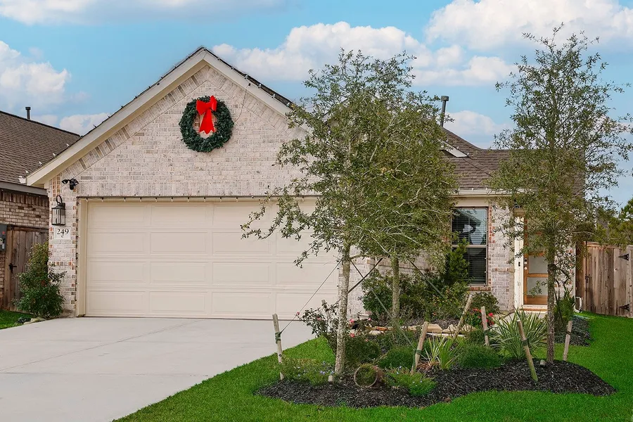 Exceptional ONE story home & location with no side or back neighbors in the beautiful community of Grand Central Park! Lovely hardwood flooring adds warmth & compliments the neutral palette. The heart of the home is the kitchen w rich stained cabinets, upgraded ss appliances, & a tasteful chandalier over the quartz island. The open plan flows thru the dining area into the family room; a back storm door allows natural light into the rooms w views to the quiet backyard. The privately located primary bedrm has a stylish barn door & accent wall with large bath, double vanities, huge shower, custom shelving. Additional updates include window coverings thruout, water softener w reverse osmosis, professional outdoor lighting, surround sound, & more. Enjoy resort style amenities, hike & bike trails, 2 lakes, nature park, playground, dog park, & The Lake House w fitness room & pavillion overlooking the lake. Convenient to I-45, shopping, dining, medical in Conroe & The Woodlands!