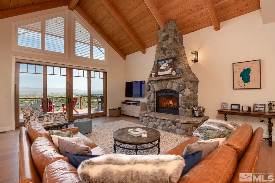 Stunning custom-built residence perched in the coveted Eagle Ridge of Genoa, offering breathtaking, uninterrupted valley vistas. Step into a spacious great room featuring soaring open-beam ceilings and double doors that lead to a private deck showcasing unparalleled views. This home includes 3 bedroom, in addition one to those bedrooms is an addition room perfect for a home office or gym, 3 full bathrooms, and a dedicated laundry room.
