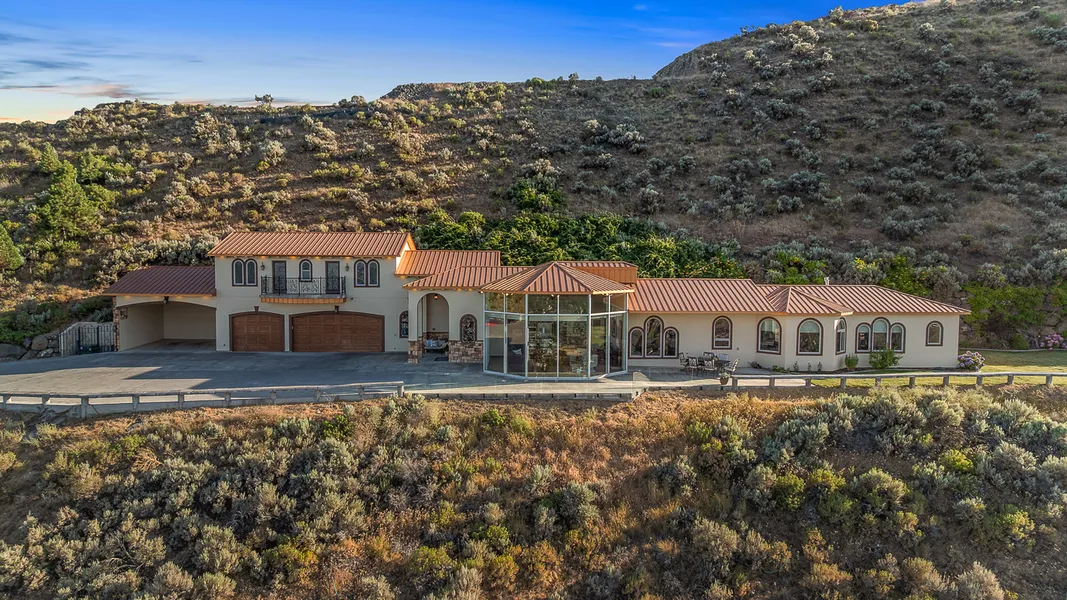 Modern Italian Villa with Unparalleled Views! The perfect fusion of contemporary design and timeless Old World charm,this custom-built villa offers a truly one-of-a-kind living experience. Set atop just over 5 acres of serene privacy, the home is perfectly positioned to capture jaw-dropping panoramic views—from the Snake River, along the full sweep of the Columbia, and beyond the White Bluffs—showcasing the entire Tri-Cities in one magnificent vista. Step inside and be captivated by soaring floor to ceiling walls of windows that flood the interior with natural light and frame the ever-changing scenery like a living masterpiece. The exquisite Owner’s Suite is a private sanctuary, at 850 square feet with a luxurious roll-in shower, 20-foot long walk-in closet, and refined finishes throughout. Down the hall, a stately office adorned with wall-to-wall cherry cabinetry offers a distinguished space to work from home—in style and comfort. The heart of the home, the kitchen, features an oversized Sienna Gold granite island, bright walk-in pantry, and new appliances, fixtures, and lighting—designed for both daily life and entertaining. Two additional bedrooms/flex rooms and a full bath complete the main level. Upstairs, you’ll find two generously-sized bedrooms, each with access to a shared balcony that takes in the breathtaking views, plus a full bath and a large storage room. For outdoor living, the spacious yard includes a graceful grapevine arbor and ample room for a future pool or garden retreat. This exceptional residence is more than a home—it’s a lifestyle. Come see it for yourself, and prepare to fall in love