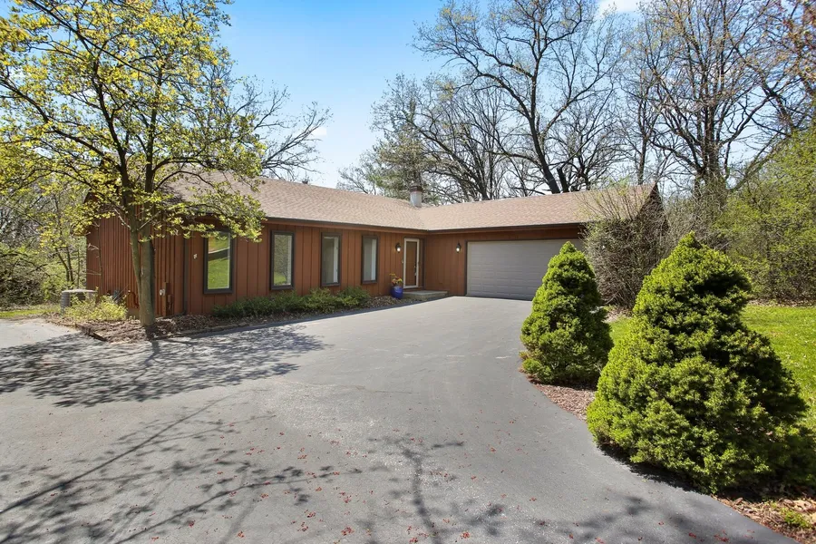 Imagine a walking trail on your own Secluded Wooded 2.2 acres! 10 minute drive to shops in Lake Zurich yet unincorporated private retreat. Front of home is deceiving... this is a 3000+ sq ft home with 4BD/ 3 FULL BATHS/ 2.5 garage, and has a very large office that could easily be a 5th bedroom. Enjoy a 68 ft x 20 ft deck that wraps around the entire backside of home that includes a vaulted screened in enclosure with skylights overlooking a pond behind your home. Master Suite and bedrooms 2 & 3 on main floor and a 4th bedroom and full bath with 2nd family room/ rec room on lower walkout level- would be perfect for multi-generational living. OPEN CONCEPT California Ranch design with a mid-century modern feel includes an enormous kitchen with wood floors,new appliances and a walk-in 8 ft pantry. Living room has original exposed wood beam and vaulted ceilings as well as beautiful picture windows to back yard. Family room all wood floors, sliding door to deck, and brick to the ceiling 2 sided fireplace. Roof is 4 years old and all mechanicals replaced in last 5 years. Home interior newly painted for next owner as well as deck refinished. This is a peaceful wooded 2.2 acres that has a small creek on the back section of property, you could grow a garden here or store your recreational toys.