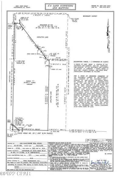 Terrific property - 25 acres and convenient to Hwy 231 and Hwy 20 for easy travel to town. Located directly on Hwy 20 for easy access - no dirt roads to traverse! Creek runs along the rear of the property; and not far from Econfina Creek. Great property for large homestead or private get-away in the woods. Currently zoned Agriculture-1, allowing for one dwelling unit per 10 acres. See photos for approximate dimensions and site description. All information was obtained from sources believed authoritative, but should be verified by interest parties - information is not guaranteed.