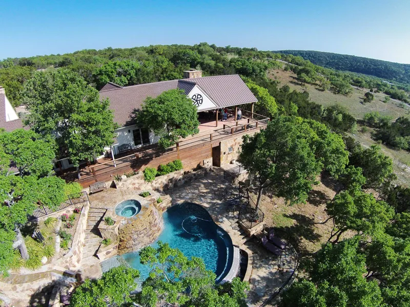 The Red Hawk Ranch on Lone Man Creek is located only 3 miles East of the beautiful hill country town of Wimberley, Texas (basic necessities, restaurants, groceries, great shopping along the square and Cypress Creek). San Marcos is only a 15 minute drive offering most anything you need; hospital, groceries, box stores, outlet mall, restau-rants, etc. The ranch has paved road access all the way to electric gated entry and the front door. As a crow flies, the ranch is only 30 miles to Austin and 45 miles to San Antonio.