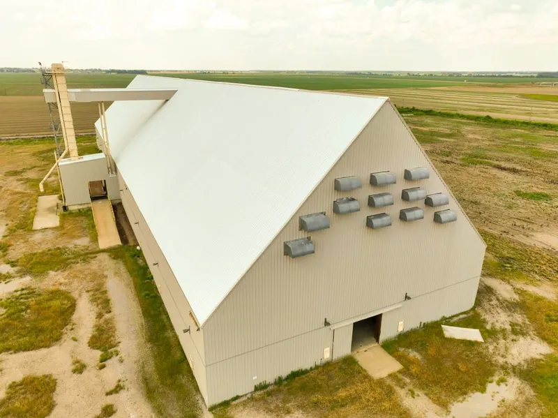 The warehouse could be easily converted for corn storage. The addition of a 10' interior sidewall would allow for the storage of 400,000 bushels of corn. The elevator and conveyors are not designed to handle grain due to the weight difference between peanuts and corn. This facility offers the opportunity to have a large amount of grain storage for less than half of the cost of building new bins.