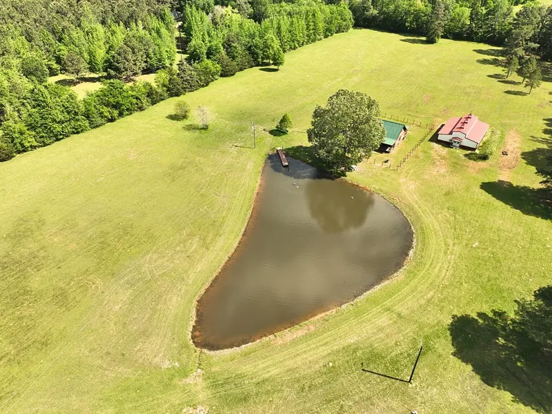 Beautifully secluded, yet easily accessed property well suited for weekend getaways, retirement or ideal country living. Custom built log cabin fully furnished with a quaint spiral stairway to an upstairs bedroom/loft. Custom built cabinets, wood work, kitchen with island, open dining room/living room combination. Sit out on the front porch with breath taking views of the manicured pasture and a pond complete with an aerator and stocked with bass, bluegill, blucat and channel catfish for the avid fisherman. Large barn wired for electricity, plumbing installed, concrete floor - could be used for storage or converted into additional living quarters if desired. RV hookup, two separate septic systems, older travel trailer with front porch, and equipment shed. Wooded area along a meandering creek, beautiful mature hardwoods & pine trees provide habitat suitable for trophy sized bucks and wild hogs. A portion of the property along the creek is located in the floodplain. Must see to appreciate!