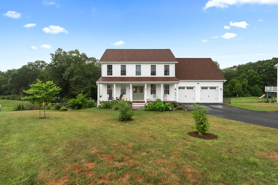 Discover this stunning 4-bedroom colonial home located on a peaceful cul-de-sac. It's even better than new! This property is on a unique lot that features a large fenced backyard and backs up to serene woods and picturesque farmland, offering exceptional privacy and natural views. The front yard can be enjoyed on the large covered porch. The first floor boasts a spacious living room that flows into an upscale eat-in kitchen with beautiful custom cabinets and a large island. The dining room is ideal for both special and everyday dinners. There's also a convenient half bath on the main floor. Upstairs, you'll find four large bedrooms, including a primary bedroom with high-end finishes such as a stunning tiled shower, a large tub, and a double vanity. The additional large three bedrooms offer plenty of closet space. The laundry room is conveniently located on the upper floor, along with another large bathroom. The walkout basement provides a wonderful opportunity for extra space for an office or family room. Easy access to major highways and downtown Mystic. Schedule a showing today! Contingent upon seller closing on suitable housing, they are under contract on a home.
