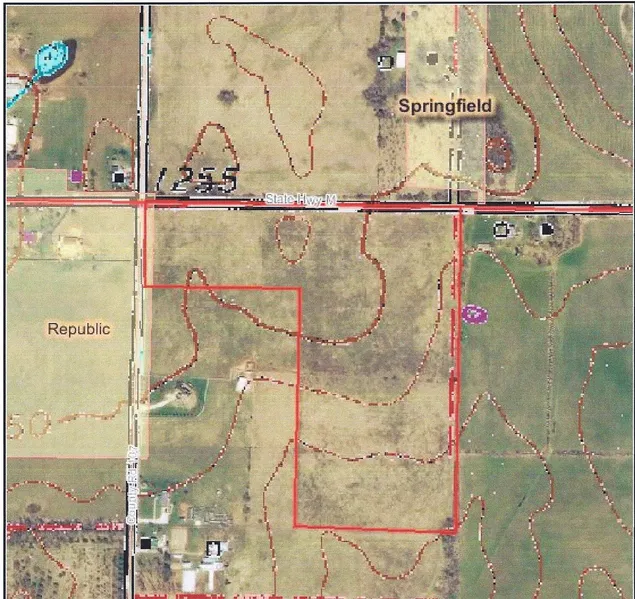 Highly visible development land with 1320 feet of frontage on Hwy M and 337 feet on Farm Road 107 on the south side of M. This parcel is just 1/4 mile East of the new Republic High School and on the boundary line of Republic city limits. The land is gently rolling to the south offering nice views and would be ideal for commercial development along Hwy M and residential development to the south.