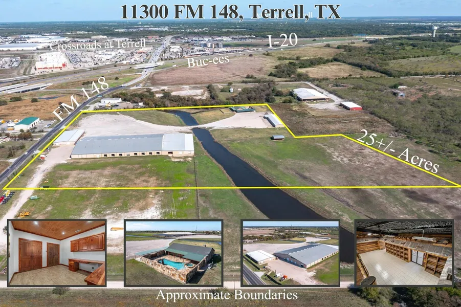 This outstanding investment & business opportunity is a one of a kind property that would be perfect for a variety of businesses! Prime location in the HOT and growing development area in Terrell. Located on 25+- AC, property features80,000 SF building with established indoor arena, seating, concession stand, 149 custom stalls, and 10,000 SF 2-story retail space. Additional metal building with offices, HVAC warehouse, conference room, 2 baths & kitchen. Beautiful rock 2168 SF, 3-bed, 2-bath home could be utilized as office with nice rustic finishes, pool, spa, waterfall, slide, outdoor kitchen, garage & carport. Property has it all, including multiple stall barns & 50 RV hookups. Previously utilized as equine & event facility with excellent visibility on FM 148 less than 0.5 mile from I-20 TXDOT Annual Count 38,123.Convenient to the Buc-ees and Crossroads of Terrell with many restaurants, shopping, hotels & more coming! Dual frontage with 1285 FT on FM 148 & 1361 ft on Davis Lane.