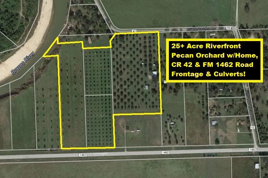 Great New Price! Ag Exempt! Riverfront 25.47 Acre Pecan Farm & Home with CR 42 & FM 1462 Frontage & Culverts. Property has 44x66 Barndominium, 36x12 Pecan Processing Center (Processing Equipment Sold Separately), 30x40 Equipment Barn (Harvesting & Mowing Equipment Sold Separately), 16x20 A/C Fitness Center (Exercise Equipment Not Included), 15x12 BBQ Gazebo w/smoker, 2 well houses w/softener & filter systems (15x20 & 9x6), irrigated pecan orchard w/329 improved variety trees & custom sign. Barndominium has Garage/Entertainment Area w/covered porch, ceiling fans, a/c half bath, 3 O/H bay doors, concrete ramp, wood paneling, attic w/deck & hot tub. Equipment Inventory Sold Separately is under Docs! 2013 Taxes including Homestead/Ag Exemptions were $2802! There's no better time than now to view this beautiful pecan orchard; Looks to be a record crop! Make appointment today for a personal viewing! Must See Property!