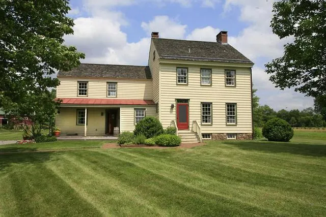 Up a long driveway, this lovely reproduction historic house has been exquisitely restored w/antique flooring, beams, stonework and vernacular detail woodwork. The country kitchen centers around an antique stone fireplace,has radiant heat, pantry and leads to an elegant din.rm w/FP and flanked by a lovely liv. rm w/FP and intimate library. Three bedrooms have sweeping views. The third floor has a fabulous new bedroom suite w/cathedral ceiling and amazing bathroom with copper bathtub, sink, fixtures as well as a slate tile shower. The back of the house is caressed by a slate terrace, edged by fieldstone walls. On 26 acres there is a handsome post and beam barn, large enough to house 4 cars or use for entertaining, another dwelling used as an office offers antique wood floors, FP, second floor and basement, and a huge third barn measuring 40' x 60' offering a tremendous amt of storage space. Beautifully landscaped and accented w/apple orchard, organic berry bushes and gardens.