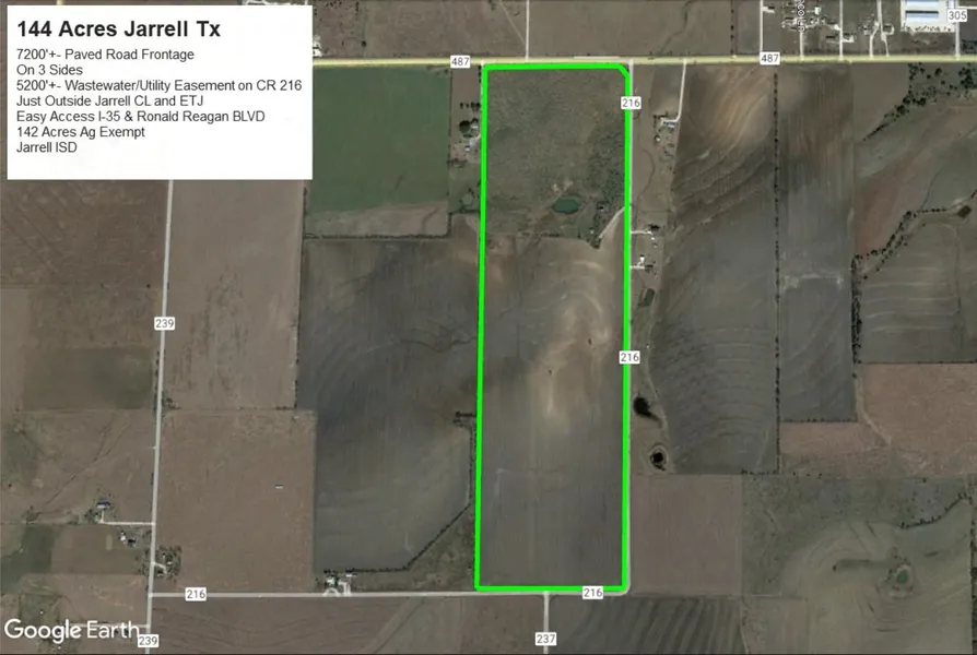 UNDER CONTRACT! A REMARKABLE OPPORTUNITY FOR DEVELOPMENT WITH 144 ACRES LOCATED JUST OUTSIDE THE JARRELL CITY LIMITS AND ETJ. THIS PROPERTY HAS 7200+- FEET OF PAVED ROAD FRONTAGE BORDERING 3 SIDES AND 5200+- FEET OF WASTEWATER/UTILITY EASEMENT ALONG COUNTY ROAD 216 TO FM 487. GREAT TOPOGRAPHY. EASY ACCESS TO I-35 AND RONALD REAGAN BLVD. APPROXIMATLEY 15 MILES FROM GEORGETOWN, 23 MILES TO ROUND ROCK, AND 42 MILES FROM THE HEART OF AUSTIN. LESS THAN 1.4 MILES FROM JARRELL HIGH SCHOOL AND JUST A FEW MINUTES FROM LOCAL SHOPPING. 142 ACRES ARE CURRENTLY AG EXEMPT. AG LEASE IN PLACE. SELLER WILL NOT BE PLACING ANY RESTRICTIONS ON THE PROPERTY. JARRELL ISD.