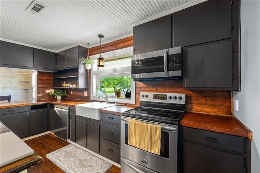 This beautifully updated farmhouse offers 4 bedrooms, 2 baths, a spacious front porch, and an additional room upstairs-perfect for an office or playroom. Set on 1.68 acres, there's plenty of outdoor area to relax and enjoy country living with modern comfort. This house also features a charming kitchen with warm wood accents and vintage-inspired lighting to complete the cozy farmhouse feel. Just off the kitchen, the dining room offers an open, inviting space with room for a large table-- perfect for all gatherings. The attic provides an extra 150 sqft of unfinished space. Motivated seller