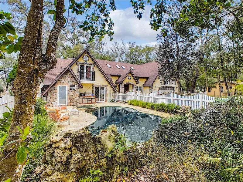 Reduced ! Bring offers. Located just minutes from The Villages which is one of the top 15 safest cities in the US in 2021. This one of a kind private estate on 2.23 acres with frontage on Lake Hattie. This home has so much potential, with a little imagination and TLC, it could be your own paradise. Outbuildings include 3 stall barn, awesome tree house, hay barn and a recording studio that could be converted into a mother n law area. Main house has a classical theatre with hydro lift to lower and raise an organ, a piano room/study overlooking the lake and treehouse, library, living & family room with fireplaces. Cherry wood floors imported from Honduras and 6x8 Mahogany front door from Spain. The hand carved faux rock on the exterior of the home was designed by UNIVERSAL STUDIOS ARTISANS. White picket fence surround the pool and outdoor patio area with a full bath. Wood beamed ceilings, circular windows, extensive woodworking, balcony's off every bedroom, 350 sf. of outdoor decking, Anderson windows and doors. Some renovations were done in 1998. The character and special features of this unique home can never be duplicated. 6 bedrooms/4 full baths make this an awesome AIR BNB or wedding venue if allowed. Sold AS IS..