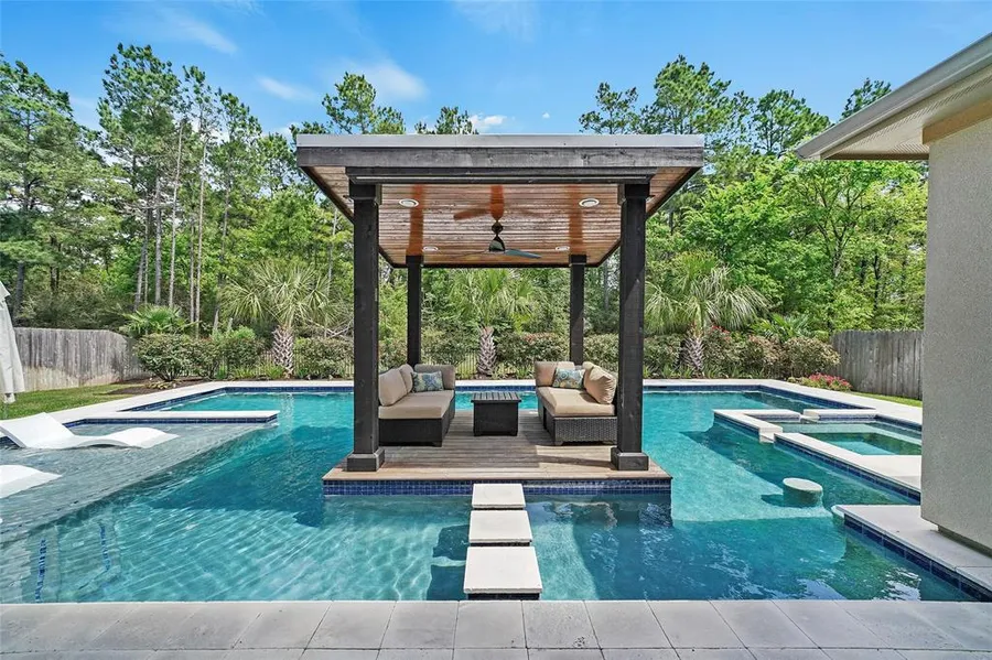 Spectacular Lakes of Shadow Creek home! This impressive home features courtyard entry w/gated loggia. Study off entry with custom built in bookshelves provides privacy while working from home. Formal dining, butlers pantry w/wine frig; walk in pantry adjacent to kitchen which features a large island w/sink! SS appliances include dbl ovens, 5 burner gas cooktop, microwave & refrigerator. Family room features gaslog fp encased in a wall of trim up to the ceiling. Wood look ceramic tiles run throughout the main floor. Master suite on main floor w/dual vanities, dual entry shower & large closet. Laundry & Guest suite w/bath on main floor. Two BR up w/Jack & Jill bath, fully wired media room, game room w/built in bar plumbed for water & a second office nook & bath. This home boasts a 22Kw generator, an impressive backyard pool w/sunning area, stepping stones leading to a mid-pool covered deck, Spa, Swim up seating. Outdoor kitchen w/grill/sink all backing to a greenbelt for privacy!