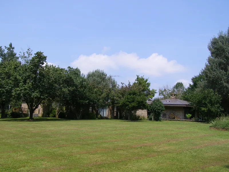 Brick home, formal living and dining room. The great room is 20x38, with 8 solid oak plank flooring. 2 spacious bedrooms, 2 full baths, carpeting, tile, and vinyl flooring. A beautiful octagon shaped kitchen/dining room has a full stone circular column that serves as a built-in grill in the kitchen and a fireplace in the living room. Separate quarters(Brm, bth, kit. & Dining), Garage. 5 Greenhouse Bases, 2 Wells, 2 Creeks, Waterfall, Pond.