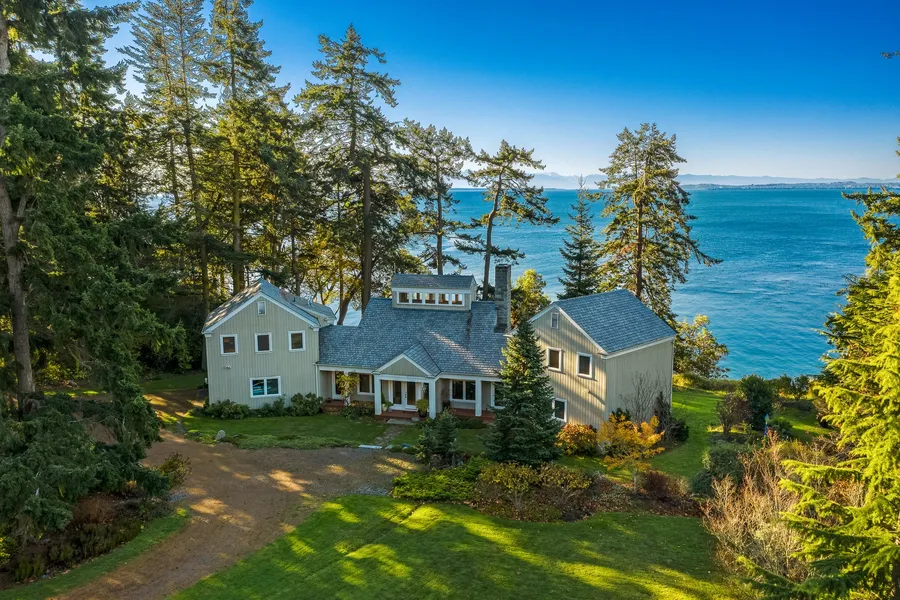 This coveted Westside medium bank waterfront residence comes with stairs to your own private pocket beach! The open great room at the center of the home with kitchen, dining and living area exudes elegant comfort and is flanked by two-story south and north wings. Take in the stunning vistas as soon as you step through the main door! The cathedral ceilings, warm woodwork and 8" planked pine wood floors, a wood burning fireplace and timeless views invite one to linger and relax. Double glass doors open up to the partially covered multi-level view deck, expanding the living space to the outdoors, perfect for entertaining and relaxing. The chef's kitchen delights with center island, concrete counters and stainless steel appliances offers plenty of work and storage place. A spacious den with direct access to the deck and a powder room on the main level and the primary suite with full bathroom and walk-in closet and private rooftop terrace on the upper level make up the north wing. The south wing features the guest quarters with private bathroom and bonus space above the double garage, a second rooftop terrace and a mud/laundry room with access to the deck. The Westside of San Juan Island is famous for its whale watching opportunities. Orca and humpback whales are frequent visitors, seals and sea lions hunt the protected bays and eagles soar overhead! The 2.4 acre grounds are well maintained and beautifully landscaped. Stairs lead down to the private pebble and sand beach, perfect to launch kayaks and paddle boards, look for beach treasures and maybe even take a dip in the ever-cool waters of Haro Strait during the warm summer days!