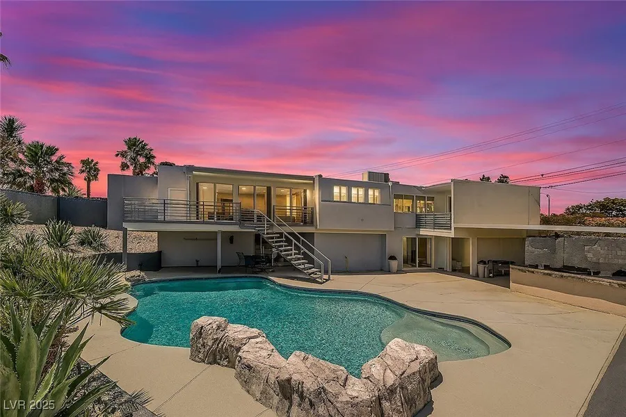 CUSTOM 2-STORY ENTERTAINER’S DREAM ON NEARLY ½ ACRE LOT WITH NO HOA—KNOWN AS OLD VEGAS’ FAMOUS “ELVIS HOUSE!” 4 BED, 4 BATH + DEN, FULLY FENCED WITH MASSIVE DRIVEWAY, SPARKLING POOL, COVERED PATIO, BUILT-IN BBQ, RV PARKING, AND NO REAR NEIGHBORS! RECENTLY REMODELED TO A GORGEOUS MODERN DESIGN. FORMAL LIVING ROOM HAS WOOD-BURNING FIREPLACE. GOURMET KITCHEN FEATURES STAINLESS STEEL APPLIANCES, BUILT-IN MICROWAVE, QUARTZ COUNTERS, BREAKFAST BAR, AND GARDEN WINDOW. OPEN CONCEPT LAYOUT WITH GAME ROOM/FAMILY ROOM AND ENCLOSED SUNROOM. HUGE PRIMARY SUITE INCLUDES BALCONY, 2 SINKS, SEPARATE TUB & SHOWER, AND WALK-IN CLOSET. DOWNSTAIRS BEDROOM NEXT TO ¾ BATH—PERFECT FOR GUESTS OR MULTI-GENERATIONAL LIVING! WOOD TILE, LAMINATE, AND TILE FLOORS THROUGHOUT—NO CARPET FOR LOW MAINTENANCE. 2-CAR GARAGE WITH BUILT-IN CABINETS AND WATER SOFTENER. TOTAL SQFT 3,526. CONVENIENTLY LOCATED NEAR SHOPPING, DINING, ENTERTAINMENT, AND FREEWAY ACCESS!