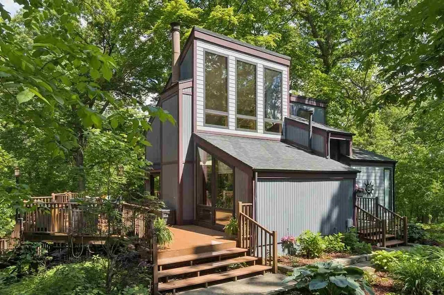 Tucked into the woods along Sugar Bottom Road, this remarkable home feels like a treehouse retreat floating above a heavily wooded ravine with stunning views from every level. Thoughtfully designed decks and screened porches extend the living space outdoors: a tiered system of decks connects the main level to a circular mid-level platform and down to a lower screened porch and patio ideal for relaxing or entertaining in the trees. Inside, the open main living area enhances the connection to nature, with wood floors in the living and dining spaces, soaring ceilings, and expansive windows that frame the forested backdrop. The main-level primary suite is a true escape with a spa-like bath and soaking tub overlooking the woods. The kitchen, with granite counters and a new range (2025), is well-sized for everyday use or gatherings. Upstairs, a lofted study area, full guest bath, and vaulted second bedroom add versatility. The walkout lower level offers a large family room with wet bar, third bedroom, guest bath with heated tile floor, laundry with utility sink, and access to a woodland patio. A rare blend of seclusion, design, and connection to nature this home is a hidden forest retreat. Fireplace/chimney for the living room is non-functional and sold in "as-is" condition. Fire seen in photos is fake and should not be relied upon.