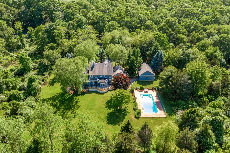 Enjoy this light-filled home on 5 acres nestled amongst a 51-acre reserve in Sag Harbor. This beautiful 5-bedroom, 4.5-bathroom traditional home is 3,800 square feet. The open living spaces consist of a large great room with cathedral wood-trimmed ceiling, sunny 4-seasons room, private den, large dining room and central kitchen which are great for gathering and entertaining, while enjoying tranquility and privacy when needed. The very large primary bedroom is on the first floor with cathedral ceiling, walk-in closet and private bath. Four more large bedrooms are on the second floor, two of which are en-suite, and two others sharing a full bath. Centrally located in the Hamptons, the home has a 3-zone "Nest" remote climate-controlled system, as well as a multi-zone central sound system for both the interior and exterior. The beach is close by and very accessible, as are numerous cleared trails for hiking and biking amongst the 51-acre reserve on the South side of the property. There is a 20' by 40' heated Gunite pool and a cleared area for future tennis court. A separate large 2-car garage has ample storage or can be converted into a large office or other usable space