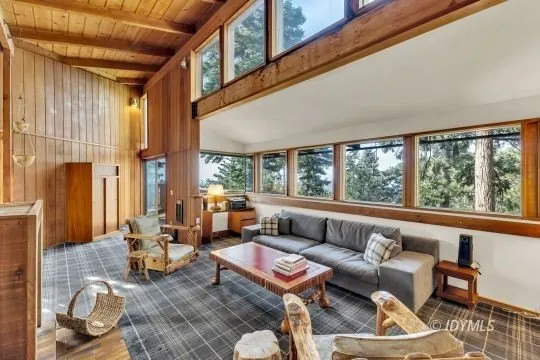 This architectural gem, designed by renowned architect Dennis McGuire as his first project in Idyllwild, CA, is a breathtaking masterpiece anchored and pinned to massive granite boulders, some of which grace the interior of the home. Clad in Simpson Redwood plywood with resawn redwood accents inside and out, the home seamlessly blends natural elements with modern design. Expansive views span from Mount Wilson-aligned with the summer solstice sunset-to Mount San Gorgonio and Black Mountain. The main level boasts a light-filled kitchen with tiled counters, a dining area, and a living room with soaring ceilings, a dramatic fireplace, and unparalleled vistas. The primary bedroom opens to a private deck for peaceful mountain moments. A lower-level guest room, featuring a cozy bay-like nook framed by glass, offers space for an office or serene retreat. Relax in the skylit shower, soak in the top-quality hot tub, or unwind on multi-level decks surrounded by nature. This rare visual jewel invites you to experience a harmonious balance of nature and design.