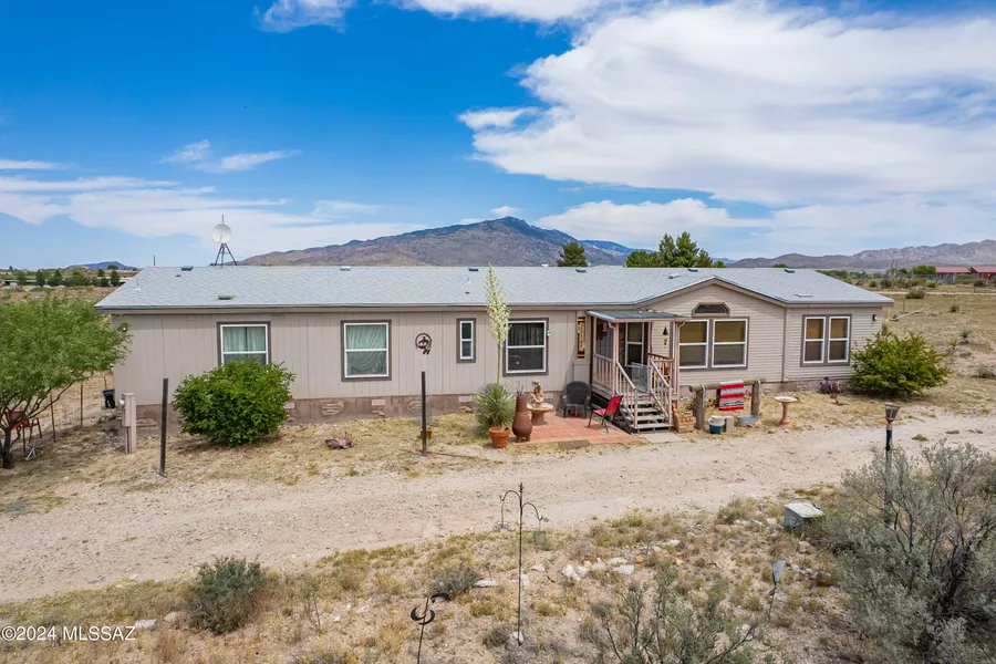 This charming 4 bedroom/3 bathroom home on 4.13 acres in Benson offers spacious living, scenic mountain views and spectacular sunsets. An office/den conveniently located between the primary bedroom and dining room provides a quiet workspace. While the kitchen area awaits your customization, there is ample space for dining and entertaining. This home boasts a large TV room, ideal for relaxation or recreation. Heating and cooking are powered by propane (owned 250-gallon propane tank on the property) while AC and hot water is electric. Primary bedroom includes a luxurious walk-in shower and large soaking tub. Vaulted ceilings grace the kitchen, living room and family room areas, enhancing the feeling of openness. Take a look and create your dream home amidst breathtaking surroundings.