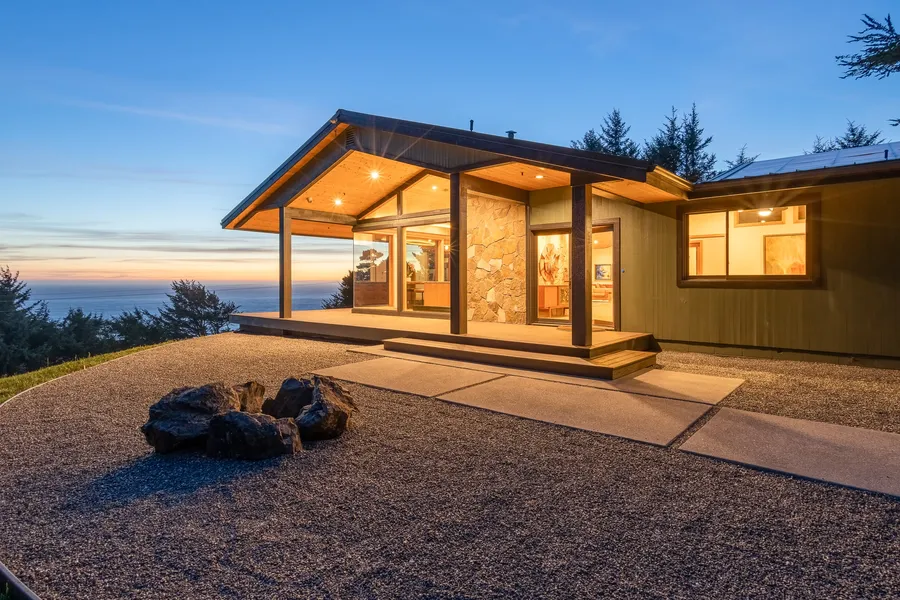 The home was remodeled with the finest design elements, finishings, appliances and craftsmanship throughout. The living room has a vaulted pine ceiling, two fireplaces, electric solar blinds, and tall sliding glass doors that open to a deck and a seating area with fire pit overlooking the ocean. The kitchen has custom walnut cabinetry, a Roma Blue Quartzite kitchen countertop island with waterfall edge, Mizu raindrop pendants, floating walnut-slab cafe table, and Miele appliances. The primary bedroom has wonderful views and the bathroom features a large two person soaker tub and huge shower with multi function rain shower head. Guest bedrooms have their own ensuite. And theres much more.