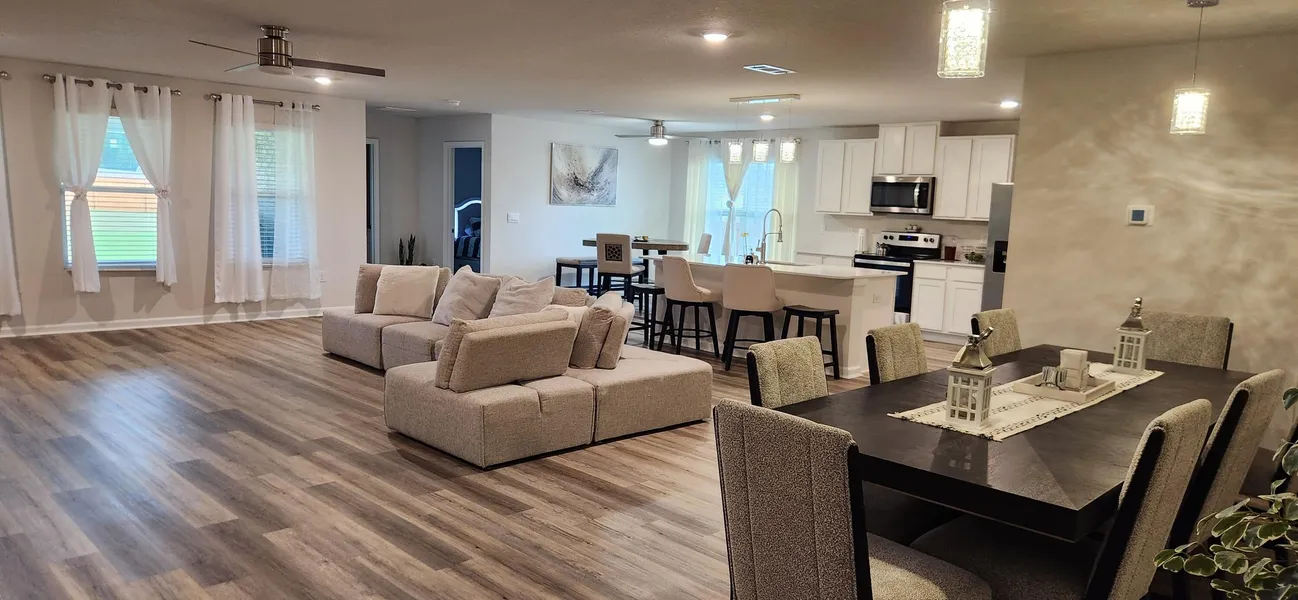 Move in Quick! Beautiful Home Better Than New! Owner has added tens of thousands of upgrades to the property. Their loss is your Gain! Just some of the upgrades to mention; New upgraded pendulum lighting in the kitchen and Formal dining area. New upgrade ceiling fans in all rooms. Under cabinet lighting in the kitchen. 2' faux wood blinds throughout the home. Fully stained lighted security fence with a double gate with metal bracing to access he huge backyard waiting for your pool or garden area. And an irrigation system to keep the manicured grass and landscaping beautiful. The Sawyer model features over 2500 heated/cooled sq ft, 5 beds, 3 full baths, covered patio, 2 car garage plus smart security features and ring door bell. Inside you will find a Well-designed kitchen features: GORGEOUS Quartz counter-tops, stainless appliances, large island with breakfast bar, smooth-top range, built in microwave, quiet dishwasher and large pantry. Nice breakfast nook & separate large formal dining area and open to a huge Great Room. Striking Vinyl plank flooring & PLUSH carpet in the bedrooms. Large Owner's Suite and adjoining bath with a walk-in Closet beautiful Quartz counter-tops, double vanity, large shower, garden tub and with an extra storage closet. 4 other bedrooms are spacious in size, with one guest bedroom with bathroom next to it and and close the door out the covered patio. The home has wonderful curb appeal with a desirable over 1/2 acre corner lot. For peace of mind owner has a current Termite Bond Contract and will offer a 1 year home warranty. Make your appointment today to view this wonderful home!