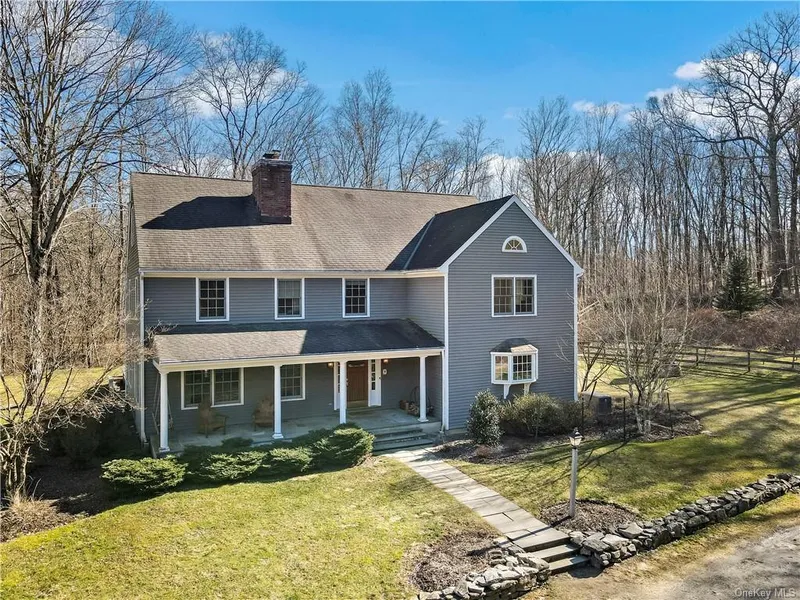 The perfect combination of nature lover's retreat, elegant country farmhouse, mini farm, with estate-like privacy. This three-bedroom home, that lives like a four, is a wonderful blend of antique warmth, sophistication, and modern living set on over 5 spectacular acres. Enter from the rocking chair front porch through foyer into an oversized, eat- in kitchen with pressed tin backsplash, granite countertops, stainless appliances and natural cherry cabinets. Notice the reclaimed, rustic wood ceiling beams and built-ins around the family room fireplace built from wood harvested from a local actor's home and creatively up cycled. Move into a spectacular open concept family room with gas fireplace which opens to an outdoor pergola/entertaining space and deck with built-in music speakers, gas grill, permanent outdoor TV, hot tub, patio and water feature. You'll love watching sports and movies in this outdoor space. Dining room with double sliders to the deck plus mudroom/pantry that also opens to the rear deck. Formal living room /music room with additional built-ins and wood burning fireplace complete the first level. Luxurious primary suite with vaulted ceiling and special perimeter lighting, two generous walk in closets and a linen closet leads to an enormous spa like bath with double sinks, jetted tub, double shower and separate WC. Features loads of storage, second floor laundry room with sink, hall bath, two additional bedrooms one with WIC and the other with two large double reach in closets. Office in landing includes two large closets. Additional living space (in process of obtaining C/O's) in finished attic on the 3rd floor( 800 sq ft included in total) and walkout basement (800 sq ft not included in total). Property includes small orchard with apple, pear and peach trees, deer proofed garden with shed and raised beds, two car garage with automatic opener, and a barn with area for storage including a separate finished, heated 2 room space ideal for home office, yoga or workout space, and more. Barn has own electric, AC, heat and security system. Basement includes a dog washing station, potential for rec room, crafting space, workout room or workshop. Part of the award-winning KL school district and convenient to NYC by train. Current owners lovingly expanded and updated this home over the past 30 years and it can now be YOURS to enjoy the fruits of their labors.