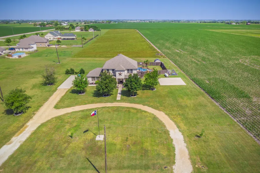 Country living on over 4 acres with tranquil views. Main level master en-suite with jetted tub, shower with 6 heads, walk-in closet and private access to outdoors, formal dining plus breakfast area and gleaming wood flooring. Gourmet kitchen w granite and stainless steel appliances. Upper level offers gameroom, 3 bedrooms and a shared bath. Covered porch and patio, pool with hot tub and sport court! Rain barrel collection system. Enjoy beautiful sunsets around the fire-pit. Easy access to Taylor.