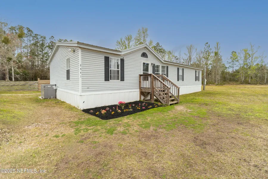 Enjoy country living on this beautiful 5-acre property, with a gated driveway for added privacy. This 3-bedroom, 2-bath manufactured home offers 1,512 sq. ft. of open-concept living space with LVP flooring, fresh interior paint, blinds & ceiling fans. The kitchen has been updated and modernized with stone countertops, tile backsplash, stainless steel appliances (new refrigerator & dishwasher - 2024), eat-in nook and a second dining or flex space nearby. The spacious primary suite features a walk-in closet and an ensuite bath with a separate shower. The oversized metal garage includes a 2+ car garage, a storage room, and a separate workshop. Additional highlights include a chicken coop, livestock pen, inside laundry, and front / back deck. Major updates include a new capacitor, fan, and blower for the 4-ton AC (2024), New metal roof (2021). Septic last pumped/inspected in 2023. Conveniently located near SR 21, First Coast Expressway and Downtown Middleburg. Nearby options include shopping, dining, schools, churches, camping, boating, horseback riding and much more!