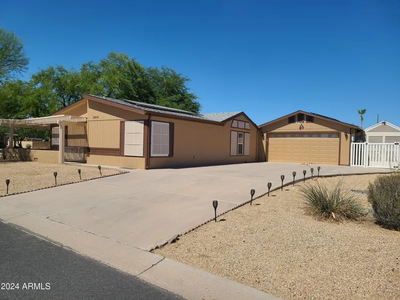 Extraordinarily upgraded 3 bed/2 bath on a large corner cul de sac lot in the upscale 55+ Sun Lakes Community. Quiet part of the community, enjoy the sunset under the trellis covered front patio. Full 2 car garage with insulated door, overhead attic storage with fan, & air conditioned & evap cooled workshop attached. Home was renovated in 2020 including the roof, gas kitchen appliances, 50 gal H2O heater, whole house water filtration and flooring. HVAC in 2021, paint in 2024. Master bedroom has a sitting room that could be used as an office or den, en suite bathroom w/jetted tub, dual sinks & separate shower. Living space has lots of natural light w/multiple skylights & open floorplan & vaulted ceilings. Energy efficient & easy to care for.. This really is a must see! Thanks for looking! This is a VA loan with little equity! Ask us about assuming it with little CTL. Top tier Palm Harbor affixed double wide was releveled in 2023. Kitchen has a gas cooktop in the center island, 2 over the sink windows, soft close cabinets, pull out shelves and bins, a large pantry and a breakfast bar. RO system in the kitchen is from 2018. Oversized closets provide more than average storage space for a home this size. Property is energy efficient with upgraded windows dual pane vinyl windows in all but the north facing bedroom, custom sunscreens for almost every window in the home, insulated garage door, and a leased solar array installed in 2024, Speaking of the garage, the epoxy floor and the custom cabinetry with pull out shelving dates from 2020 as well. The garage has it's own mini split system as well. The workshop has an exterior garage door, and the garage has a third exit that leads to a 23 x 11 greenhouse style shed affixed to the east side. The driveway is three cars wide at the garage entry, so there is easy access to the east side yard, which is fenced off with privacy height vinyl fencing. All on a easy to care for landscaped property with drip irrigation and yard lighting. Sun Lakes as a community provides a "resort vacation" lifestyle and country club living with several gated communities. Sun Lakes includes five adult country club communities. Residents and guests enjoy several 18 hole and 9 hole golf courses, five club houses, and restaurants. Amenities also include a number of cafes, heated community pools, hot tubs, driving ranges, tennis courts, health clubs, arts and crafts centers, whirlpools & saunas, billiards, pro shops, stocked fishing lakes and miles of walking paths with green grass, desert-scape, and lake side views. There are hundreds of clubs based on interest, like computers, photography, arts, or groups like the 40's, 50's, 60's clubs to find people at similar life stages. Explore Sun Lakes of Arizona website for information and make Sun Lakes your home. Located minutes away from the Chandler Fashion Center Mall, and major high tech companies like Intel, Sun Lakes provides convenience and a comfortable lifestyle. With upscale shopping plazas, a community college campus, public library, a variety of restaurants, boutiques, spas, professional and health care services providers, Sun Lakes is has it all! Just 20 minutes from Phoenix, Sun Lakes has convenient access to major routes and is minutes from I-10, routes 101 and 202. Nearby, Sun Lakes residents can enjoy, casinos, and attractions like Firebird International Raceway and Rawhide, an 1800's old west town.