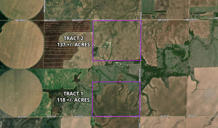 Tract 1: Possession will be after the 2024 wheat harvest. The seller will be reserving the 2024 wheat crop. Tract 2: Possession will be upon closing. The buyer will receive 1/3rd share of the crop and be responsible for 1/3rd of the fertilizer, crop insurance, and chemicals.