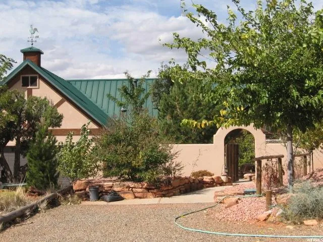 Lil Bit Ranch is a horse boarding facility sitting on 23 acres minutes from Kanab. Set up with a riding arena, fenced range, auto watering trough, horse washing station and various outbuildings. Power & water plumbed throughout property. Includes a large quonset building with loft, wood stove, water, power and 14' doors. Various corrals, chicken coop and hay barn on upper bench. Home has new patio for entertaining, complete with fire pit and bar. Main floor living is spacious and open with timbers in the gourmet kitchen. Separate entrance to west wing bedroom & courtyard which could be used for B&B. Large master suite that has amazing sunrises over the red cliffs. Finished, insulated garage with shelving & workbench. All vegetation around home is on auto drip or sprinkler system. Fenced irrigated garden area has fruit trees. Private entry gate from Hwy 89. Mile long walking/ATV trail around perimeter of property. Check out the pictures of this unique property and give us a call to set up your appointment to check it out!